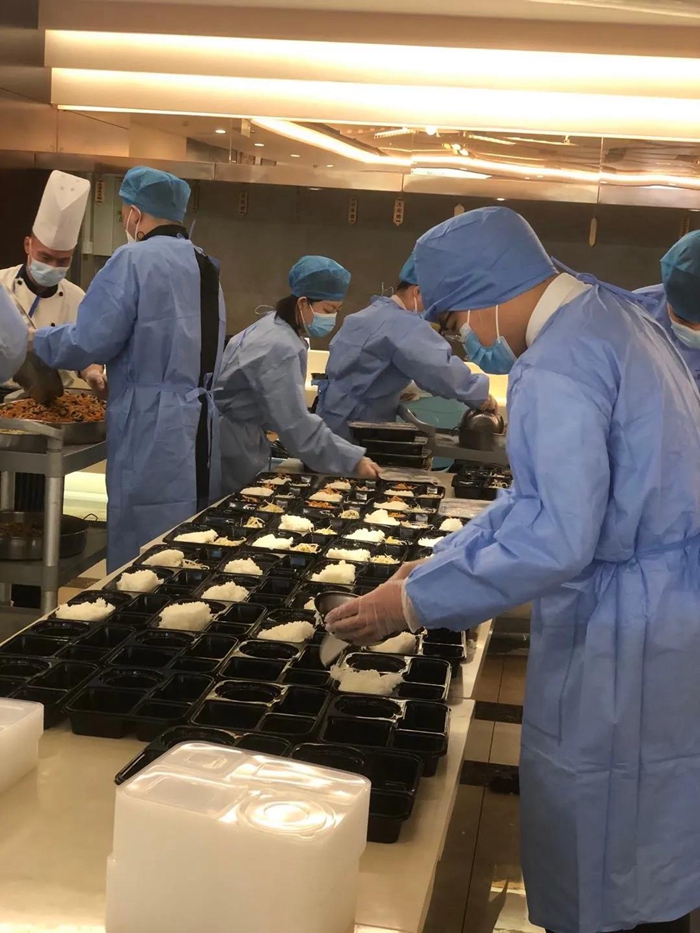 酒店第一时间成立防疫领导小组,在领导小组正副组长王强、郑冰、白江指挥调度下,各项准备工作有条不紊地进行:对酒店进行分区管理,将酒店整体划分为生活区、缓冲区和隔离区,并按照相应区域,张贴了相应颜色标识,明确要求各区人员只允许在本区域内活动,严禁跨区工作、串区走动;酒店负责人白江带领美居酒店指挥部成员开展员工培训、物资准备工作。物资准备是个细活儿,要为客人准备足够14天用的各类物品用品,包括大量洗漱用品、足量的饮用水、体温计等;针对餐食卫生、病毒消杀、客房服务、垃圾清运等各方面工作制定明确的工作方案;要求领导小组人员要24小时轮岗值班,党员和骨干带头坚守岗位,直至完成隔离观察任务。