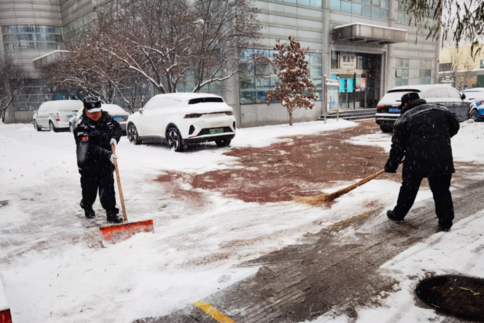 刚到单位的干部职工,纷纷拿起扫帚、铁锹,加入到扫雪除冰大“会战”的队伍中。大家齐心协力、现场一片热火朝天,干净整洁的道路很快清扫出来,保证了干部职工出行安全。