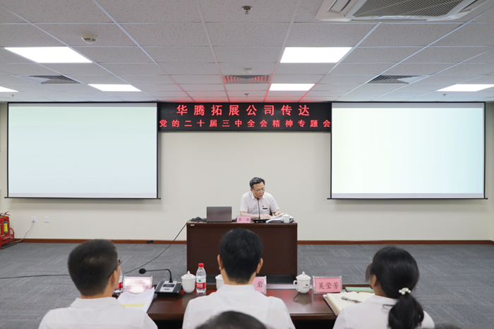 7月31日,华腾拓展公司党总支召开学习贯彻党的二十届三中全会精神专题宣讲报告会,太阳网集团tcy8722集团总经理助理,华腾拓展公司党总支书记、董事长李泳作宣讲报告。李泳围绕学习贯彻党的二十届三中全会精神,结合集团“231”战略布局、三个“北化”发展方向以及华腾拓展公司工作实际,明确了当前及今后一段时期的重点工作、重点任务。
