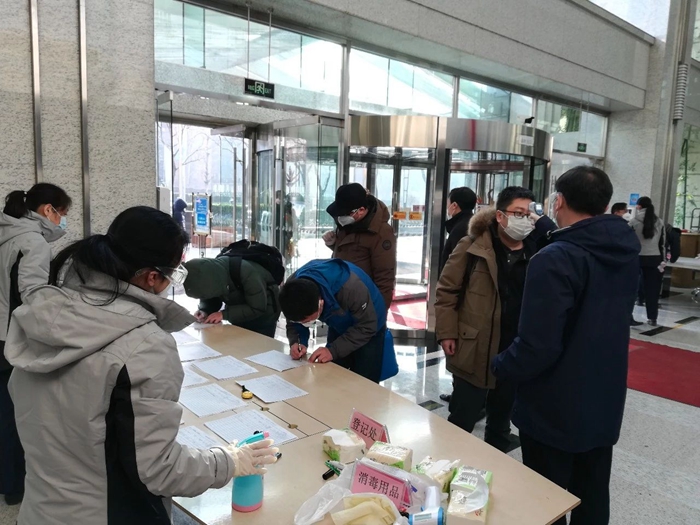 早上8:10,各岗位人员按照前一天下午预案推演的分工,各就各位,各司其职,等待着入楼办公人员高峰的到来。大厦员工身着工装,佩戴手套、口罩和护目镜,分列于两个侧门入口,有的做好入门信息登记,有的手持测温仪挨个测体温,有的在门口引导人员分高层和底层两个口入楼。