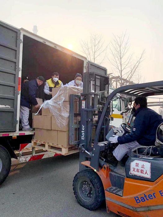 2月14日,全市普降大雪,当天又新运到5000箱500ml装消毒酒精,华腾化工的职工们人抱肩扛、冒雪完成了卸车任务。