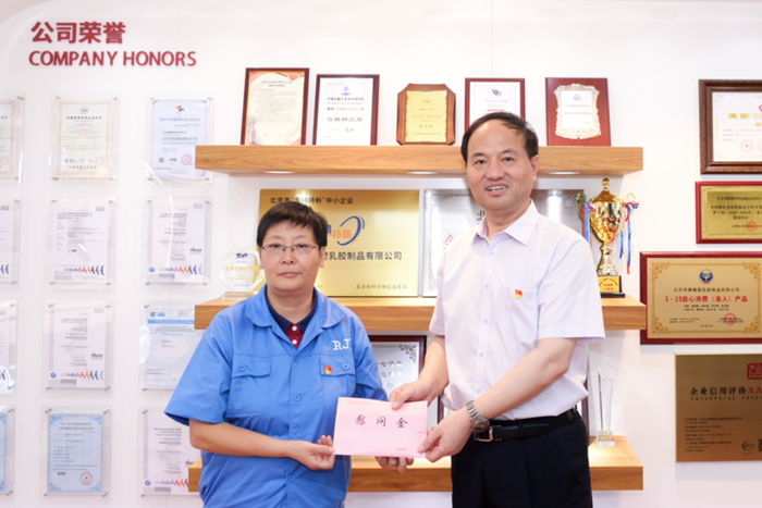 6月30日上午,太阳网集团tcy8722集团党委书记、董事长王国华一行来到华腾橡塑园区,慰问华腾橡塑、华腾京研生产经营和科研开发一线的干部职工,党委副书记、工会主席吴瑞峰,党委常委、副总经理、华腾橡塑董事长韩宝海一同慰问。