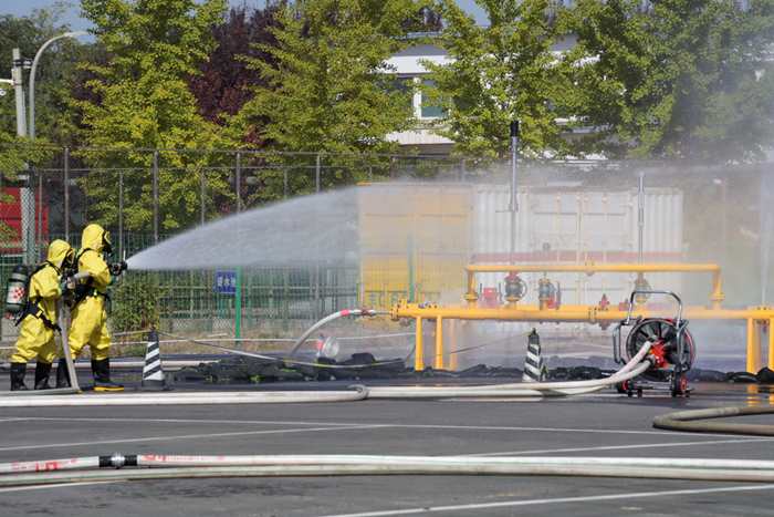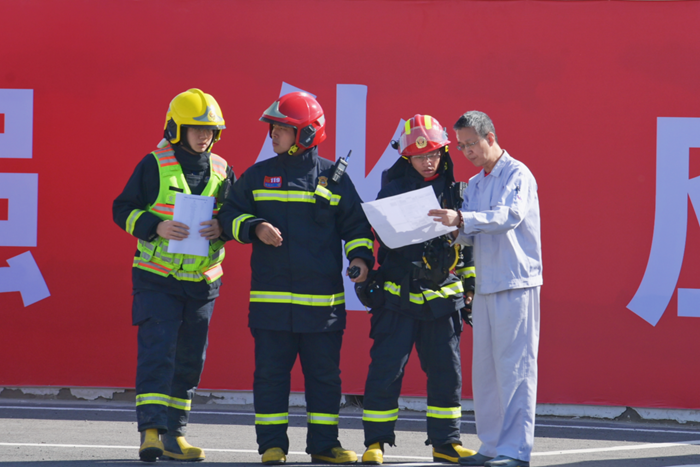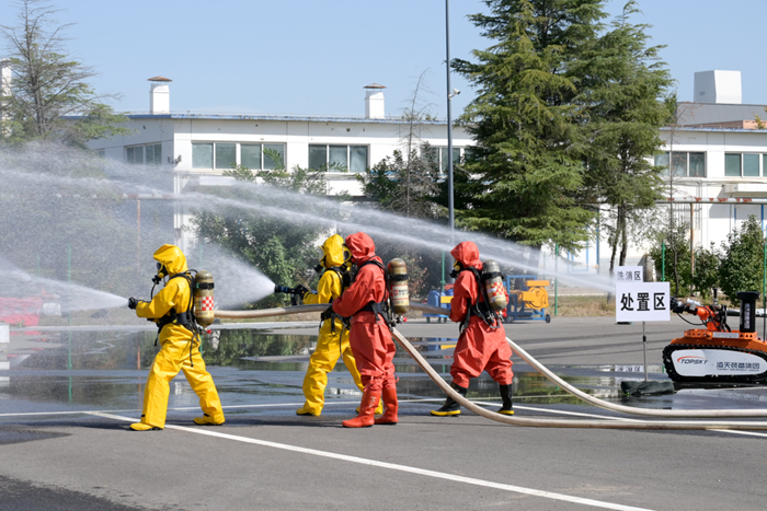 演练紧张而有序,周边有毒有害气体浓度监测和侦检、事故现场火灾扑救、空气中可燃气体和有毒有害气体浓度稀释、泄漏危险化学品输送管道堵漏……环环相扣、环环跟进。