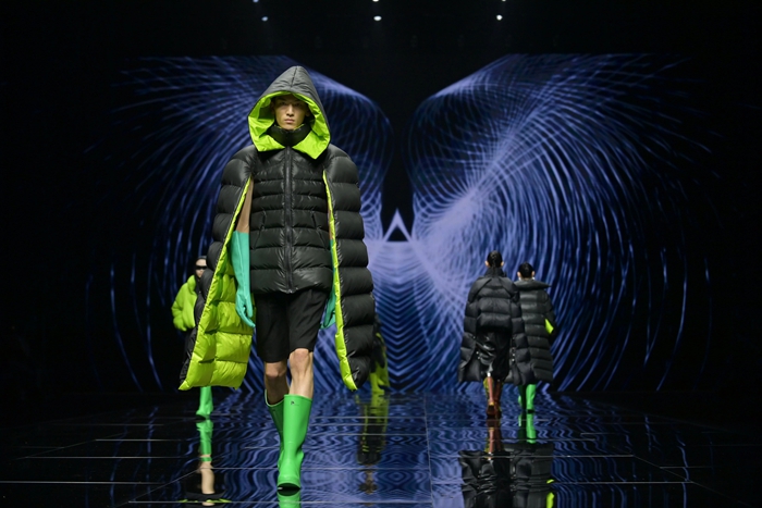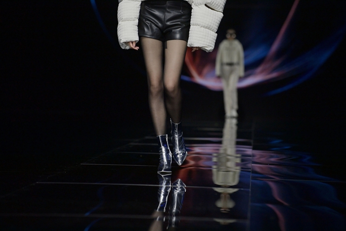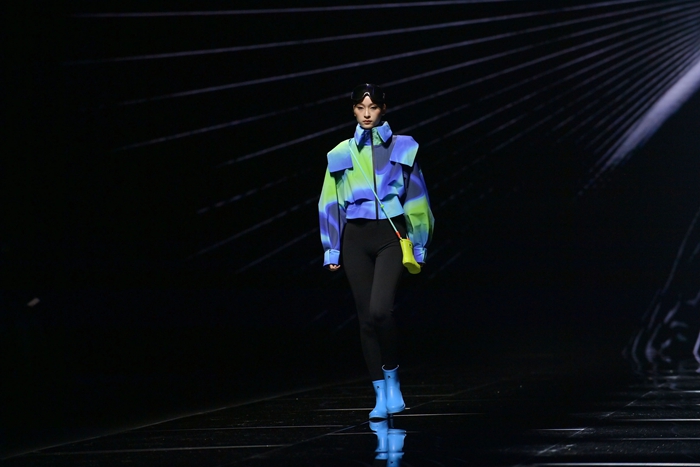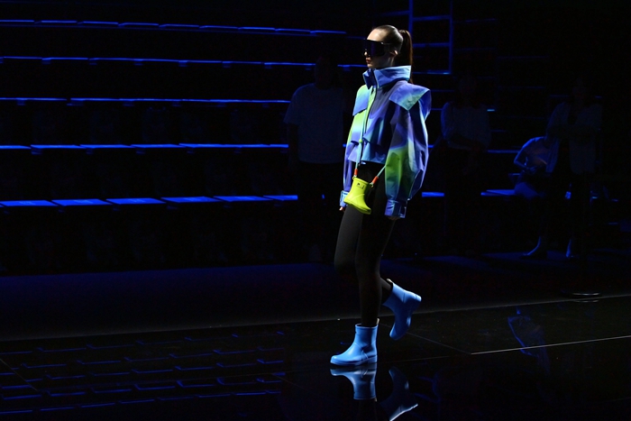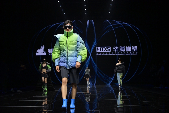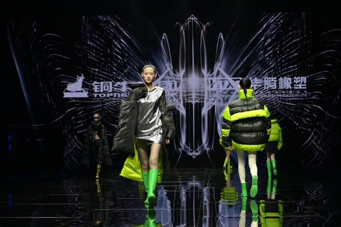 整个秀场,靓丽前卫的胶靴或踏于足下,或成为时尚新品挎于体侧,伴着强劲的乐曲,绽放出化工科技在时尚前沿的另类美学。