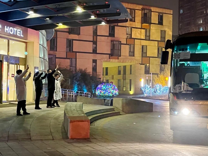 2月12日大年初一夜里,正当人们阖家团聚喜迎新春之时,华腾美居酒店干部员工却以“欢送”的方式迎接这一喜庆时刻的到来。此时的华腾美居酒店大堂门前,北化房地产公司党总支委员、副总经理、美居酒店负责人白江正与酒店管理人员一起守候在门口,向鱼贯而出的人们挥手告别,目送他们踏上回家的大巴车。同样的一幕在次日的大年初二夜里再次上演。至此,262名隔离人员在华腾美居酒店完成21天隔离观察,并经核酸检测为阴性后,于2月12、13日大年初一和初二夜里,分两批全部踏上了返家的路途。