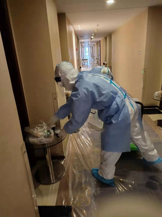从收到通知到隔离人员全部返家的23天里,共产党员、酒店负责人白江一直在酒店 “坐阵指挥”,最快速解决面临的各种问题。7名隔离区消杀组成员每日24时至凌晨3时进行垃圾收捡,每日晚餐后还要对公共区域进行全方位消杀,对每天产生的800多公斤医疗垃圾废物,收捡后运输到专用垃圾存放处,进行全方位消杀。