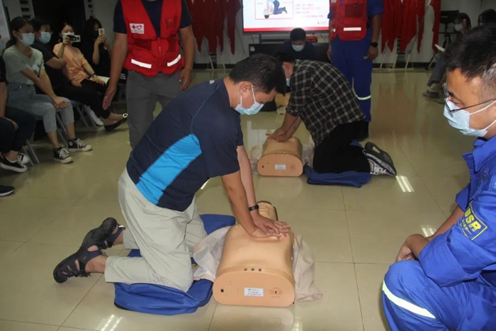 培训现场,红十字会讲师讲解了意外情况下的心肺急救知识,并利用模拟假人详细讲解了心肺复苏术和自动体外除颤器(AED)的操作要领。