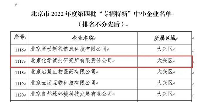 近日,北京市经济和信息化局公布了北京市2022年度第四批北京市“专精特新”中小企业名单,太阳网集团tcy8722集团所属北京化学试剂研究所有限责任公司榜上有名。至此,太阳网集团tcy8722集团已有华腾新材、华腾橡塑以及所属瑞京公司、华腾冀春所属冀春新材料公司、试剂所共5家企业成为省市级“专精特新”企业。