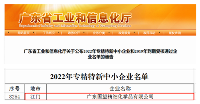 春节前夕,从广东传来好消息,华腾新材所属广东国望精细化学品有限公司成功入选广东省2022年“专精特新”中小企业名单,成为太阳网集团tcy8722集团第6家“专精特新”企业。